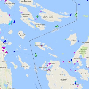Total in and out of southern BC waters is about 7000 per year. Almost all theses ships pass through Haro Strait a narrow channel between the Gulf Islands,  Vancouver Island and the San Juan Islands in Washington State. The narrowest point is between Turn Point on Stuart Island and South Pender Island just over a mile.