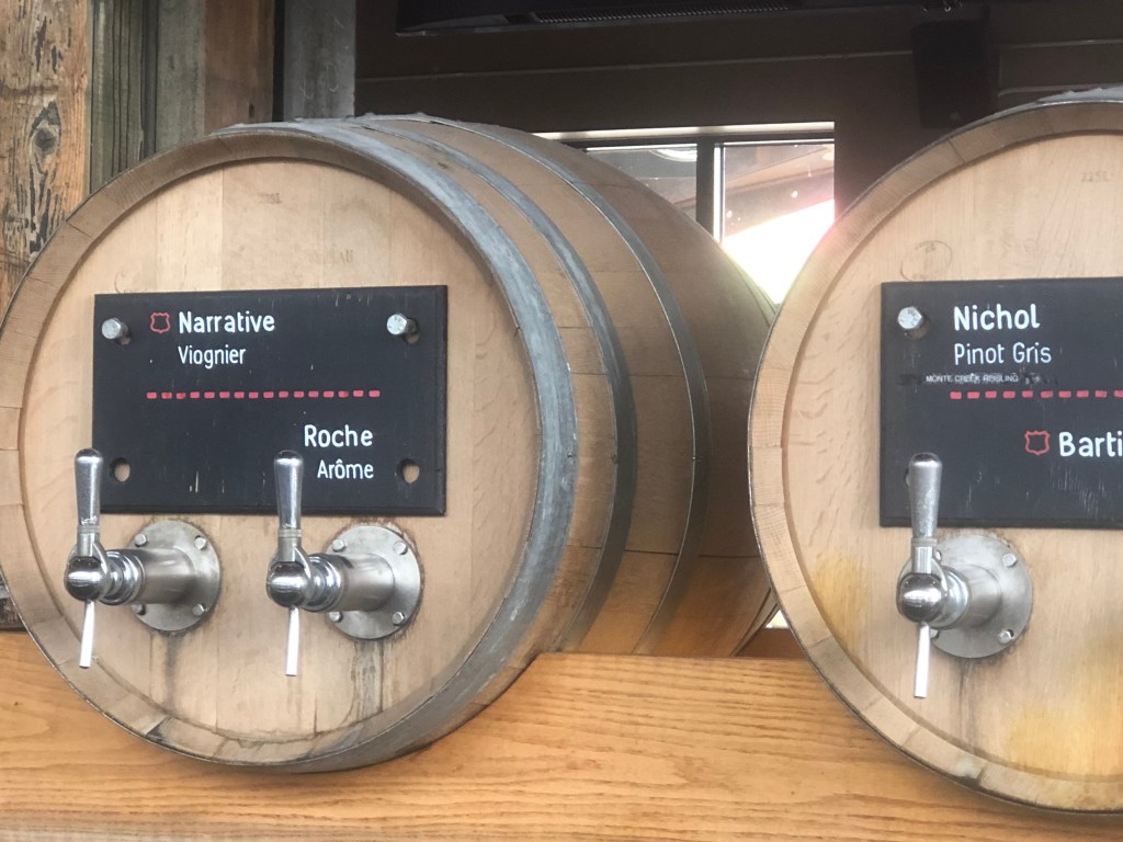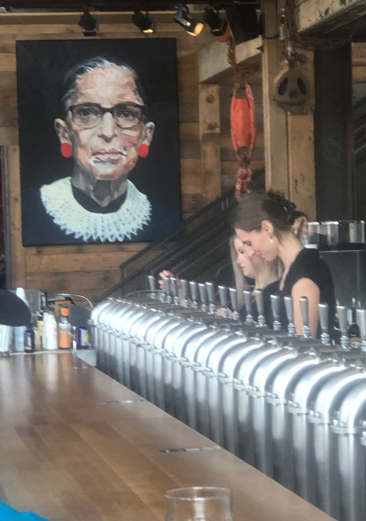 After a walk about through LONSDALE Quay market we stopped at the Tap & Barrel which is in a former shipyard building. Impressive joint with several dozen beers on tap as well as about 18 wines on tap. We opted for a Blue Grouse Pinot Gris from the Cowichan Valley and were not disappointed. Not sure why a portrait of Ruth Bader Ginsburg is on the wall in the tap room.