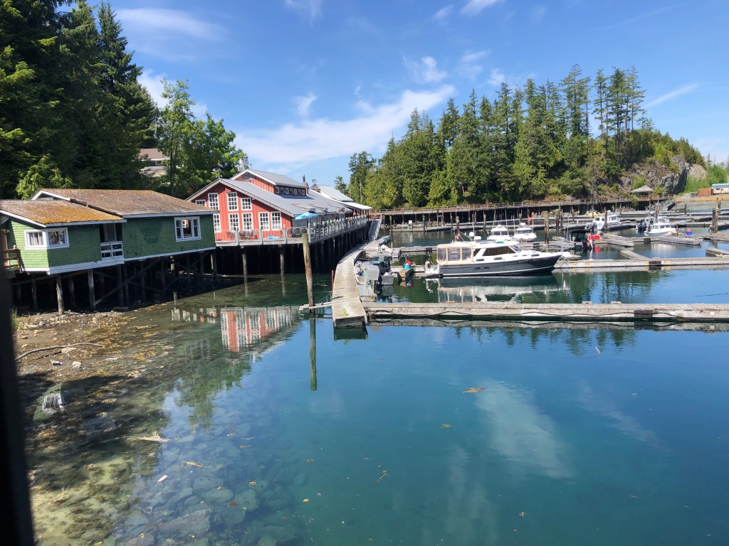 Since we were a little peckish a short walk down the boardwalk took us THE OLD SALTERY PUB, a really cute pub with a long deck overlooking the harbour. An order of Calamari with a glass of wine was so good a second was ordered. Interestingly, our server was a charming young lady from Brittany in France. Turns out that most of the staff here are from overseas. We later met a girl from Austria, two from New Zealand and another from Germany. All were loving the west coast experience. We were, too as we watched a variety of boats come into the marina.