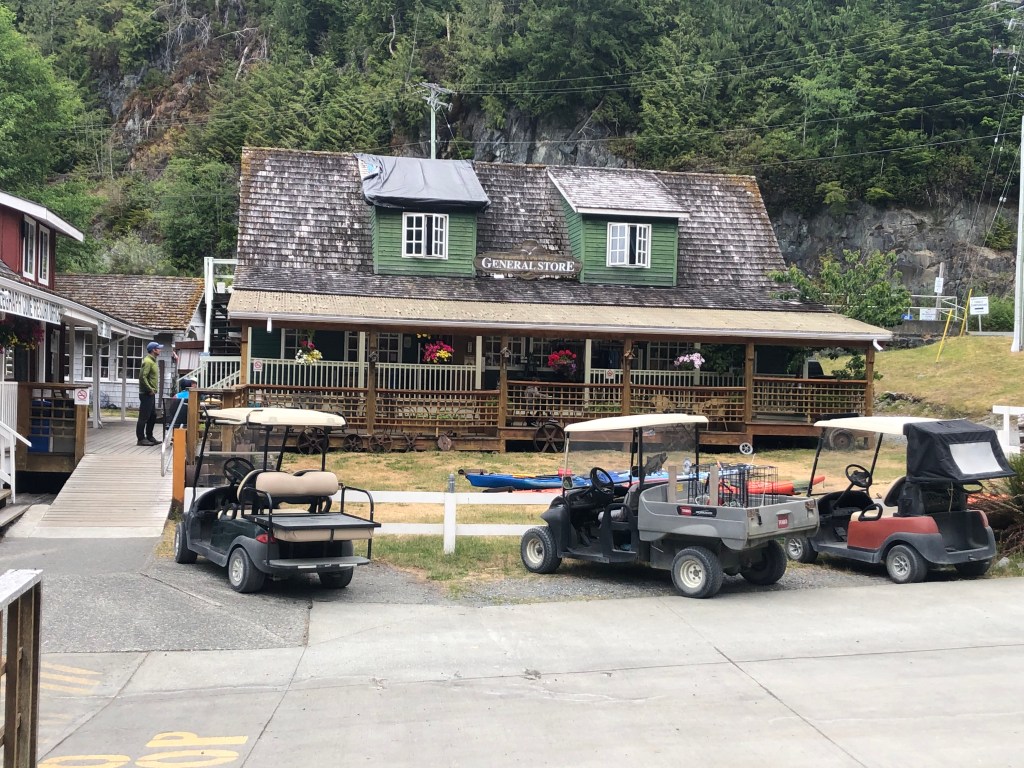 Dinner was in the KILLER WHALE CAFE, right beside the pub. Its quite large and was full on a Wednesday night. Since we had overindulged in Calamari we opted to just order an entree. No appetizer or salad. Sheila chose the Chicken Souvlaki with Pita Bread and I liked the Seafood Carbonara. Both were delicious. A half litre of Pinot Grigio washed it down. We had a window table with a view of the Marina. We enjoyed it all. Check out the menu here. https://telegraphcoveresort.com/2021-dinner-menu/