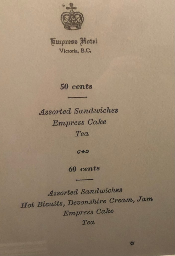 It’s still the Empress but it certainly has been spruced up. In the corridors there are some fabulous photos of the hotel under construction showing the pilings the hotel is sitting on and the steel beam construction. And photos of the Royals who have visited. This photo of the Tea menu was interesting. Fifty cents for afternoon tea. It now costs over $100. Talk about inflation.