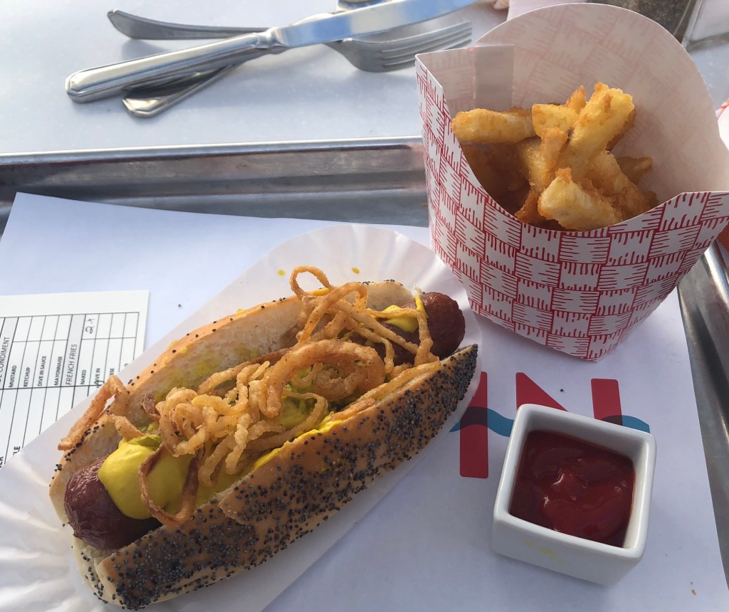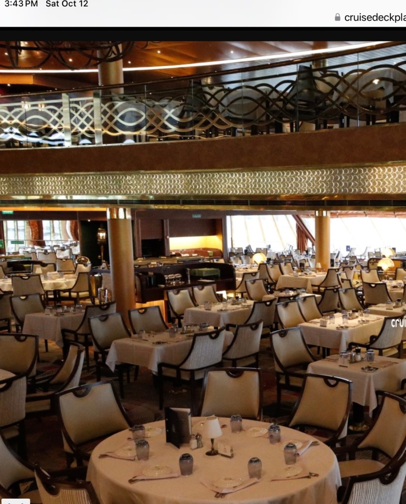 The Zaandam has several restaurants to supply the 1450 passengers on board and they are all good. Starting at the most casual at the DIVE IN, a take out joint adjacent to the Lido Pool. A variety of burgers, make your own Tacos and , my favourite, Nathan’s Famous Hot Dogs are available all day. Had a Hot Dog which came with Crispy fried onions. So good. The French Fries were excellent too which on several occasions we paired with a cold glass of Pinot Grigio whilst lounging near the pool. The Burgers looked good and we saw many passengers choosing them.